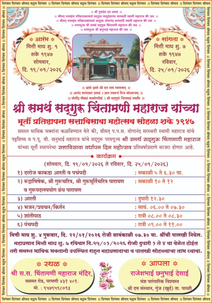 समर्थ सद्गुरु श्री चिंतामणी महाराज मूर्ति प्रतिष्ठापना वर्धापन सप्ताह उत्सव, परभणी येथील श्री चिंतामणी महाराज मंदिरात दि.१९-०१-२०२५ ते दि. २५-०२-२०२५ ह्या सप्ताहात साजरा होणार आहे.
